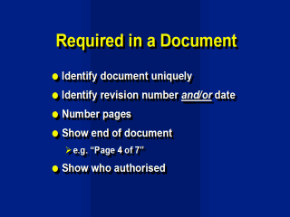 required within a Document ? The version of each QMS document must appear on the document. This may be in the form of a revision number or a date. Both revision number and date sometimes appear, but this is not essential, and using both sometimes makes errors possible. It is essential for pages to be numbered. It is also essential to show where the document ends, so that misinterpretation cannot occur due to the physical loss of pages from the end of the document. Commonly this is done by numbering pages in the style "page 4 of 7". However, a statement such as "End of Document" will serve just as well. Care should be exercised in using the page numbering features of word processing software. It is possible to accidentally generate a document with the wrong total page number. This may lead to a final page numbered as e.g. "page 8 of 6". This is a breach of document control. |