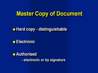 In a paper-based system of document control, this is a hard copy, with is distinguishable from the authorised copies, perhaps because it is on a different type of paper. Alternatively, an electronic version of a document can serve as a master copy, provided that it is appropriately protected from unauthorised alteration. Each document, when issued or revised, must be authorised by somebody with the authority to do so. On a hard copy, the evidence of this authorisation is usually the person’s signature. Authorisation through a computer is also acceptable, provided that the system prevents unauthorised people from performing the authorisation. |