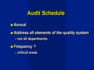 during the year. All elements of the QMS must be addressed in the schedule but these elements do not need to be examined in every laboratory. The frequency of audits is left to the judgement of the Quality Manager; neither ISO 9000 nor ISO 17025 specify how often audits are conducted. Audits should be scheduled ‘on the basis of importance and status’ which means that critical areas which will affect the quality of your test result should be visited more frequently than those activities of less importance. Remember, not all of the element of the QMS have equal impact on the quality of a test result. |