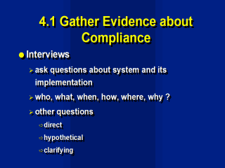 techniques: Interviewing staff Ask questions about the system and its implementation. Six questions which will provide information effectively and efficiently are: who, what, when, how, where and why. These questions will produce answers of substance and keep dialogue flowing between the auditor and auditee. Other questions to ask: