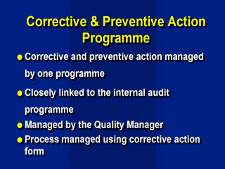 the begining of the lecture? Corrective and preventive actions are managed and resolved within the one programme. The corrective and preventive action programme is closely linked to the internal audit programme. The internal audit programme identifies problems or areas of improvement and the corrective and preventive action programme is the mechanism for recording and resolving these. It is the responsibility of the Quality Manager to establish, document and maintain the programme. |