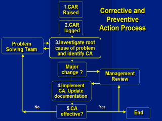 The problem/improvement and the steps towards its resolution are managed and recorded on the Corrective Action Request (CAR) form. During each step of the process the CAR is passed between the staff responsible for completing each task. After each stage the relevant section of the CAR is completed. An example corrective action form is supplied at the end of this section. |