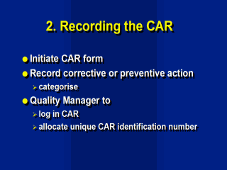 Each step in the corrective action process is documented on the CAR. The details of the action i.e. the problem or possible improvement, are recorded by the person who identified the issue. In most cases this person is referred to as the ‘originator’. The originator should categorise the problem/improvement i.e due to equipment, problem with procedure, customer complaint etc. This information can be used to analyse the corrective and preventive action program to determine in which area of the organisation the CAR should be dealt with. At this stage the Quality Manager allocates the CAR with a unique identification number and logs its existence into the CAR log. This provides the Quality Manger with the ability to track the corrective action (CA) and chase up outstanding CARs. |