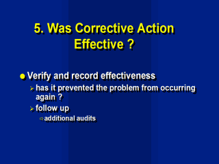 problem from occurring again ? Before the CA can be closed out a relevant staff member must review the change and verify its effectiveness. If the nonconformance was minor and was not required to be rectified urgently the verification follow up may be included in an internal audit. If the nonconformance was major a ‘mini’ audit should be conducted to check the CA effectiveness. This verification must be recorded on the CAR. If the CA was effective and prevented the problem from occurring again without affecting the QMS then the Quality Manager can close out the CAR. The CAR log must be updated and the CAR filed appropriately. If the change to the system did not resolve the problem or caused another problem within the QMS, then the CA must be reinvestigated and a new CA developed. |