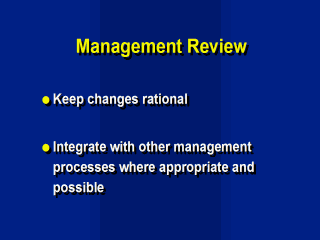 an organisation, and not to be a burden. If the process is experienced as not being helpful, this is an indication that management review could be carried out in a better way. Where possible, management review should not be introduced as an extra activity, unrelated to the other management functions of the laboratory. If regular meetings of senior management are already in place at the time when management review is introduced, then it may be best to modify these meetings so they include management review in compliance with the standards. |