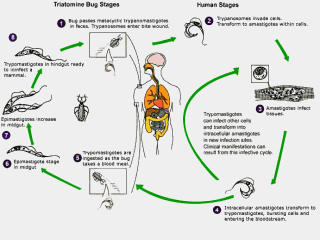 | The life cycle of T. cruzi can begin with a wide variety of domestic (dogs, cats, pigs) and wild (rats and even bats, and marsupials) animals, which serve as reservoirs for infections. The trypomastigotes in the blood stream are slender, spindle-shaped forms, 15-20 m m in length having a nucleus, terminal kinetoplast, undulating membrane and a long flagellum. They are thicker than most other species, wellknown by their C-shape: C. The period is the kinetoplast. |