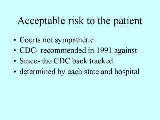 Although the center of disease control recommended in 1991 against infected surgeons operating, they have since back tracked and left the determination to each hospital and state. Yet courts have not been sympathetic and giving operating privileges to infected surgeons is now unusual. |