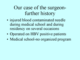 Our surgeon was injured with needle sticks during medical school and during residency, and he operated on HBV positive patients. In the medical school there was no organized preventive program. |