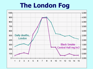 London during the first 15 days of December 1952. After a rapid decrease in temperature, levels of air pollutants, as represented by black smoke in this figure reached very high concentrations. It has been generally agreed that about 4000 excess deaths resulted from the 1952 fog (Ministry of Health, 1954). Subsequent studies, however, have discussed such appraisal as they estimated about 12,000 exceeding deaths occurred from December 1952 through February 1953 because of acute and persisting effects of the 1952 London smog (Bell and Davis, 2001). Besides the impact on mortality, those who were severely ill had histories of chest complaints, and in some cases hospital admissions for respiratory and cardiovascular causes quadrupled the expected rates. |