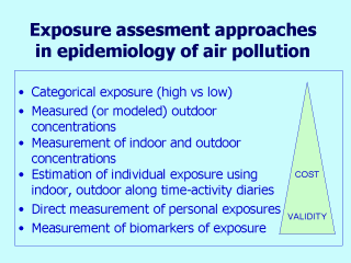 They refer to the observation of events which develop among human population under natural conditions, circumstances which form their most significant advantage. When measuring exposure to air pollution, many studies have used data from air pollution surveillance networks, but other approaches to asses exposure are increasing, ranging from consideration of residence as an approximation to the exposure level to pollution or exposure questionnaires, to the use of personal samplers or the determination of biomarkers (Ozkaynak, 1999). This Figure shows the main exposure measuring methods used in the field of epidemiology. A rise in the grade of sophistication makes measurements more valid, but it also affects their cost.