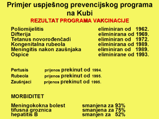 Zdravstveni sustav Kube je sveopći, besplatan, dostupan, i s jakim naglaskom na prevenciji i informiranju. Kuba je u nekoliko posljednjih decenija postigla značajno produljenje očekivanog životnog vijeka i značajno smanjenje smrtnosti rodilja i novorođenčadi. Gotovo sva ta dostignuća mogu se pripisati preventivnim aktivnostima. Ovaj slajd pokazuje uspjehe programa cijepljenja na Kubi. Slična postignuća mogu se naći u Švedskoj, Finskoj i nekim dijelovima Indije. Očito je da u posljednjih pola stoljeća prevencija u većini zemalja i dalje ima snažan pozitivni učinak. Autor: Peter G. Bourne, Kuba Javno zdravstvo na Kubi |