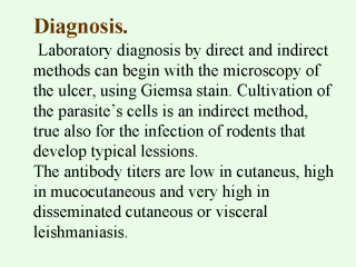 | The Montenegro intradermal reaction is highly specific and of great use in cutaneous leishmaniasis, although the test may be negativein the disseminated form. Cellular immunity depends on T lymphotcytes and becomes positive 24-48 hours after infection. Other techniques used are indirect immunofluorescence, ELISA, Dot-ELISA and indirect immunoglobulin tests. Quantitative tests are used to follow therapy. |