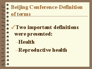 of disease or infirmity. Reproductive health: is a state of complete physical, mental and social well-being and not merely the absence of disease or infirmity in all matters relating to the reproductive system and to its functions and processes. |
