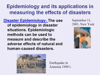 Similarly, epidemiologic methods can be used to measure and describe the adverse health effects of natural and human-caused disasters and the factors that contribute to those effects; the overall objective of such epidemiologic investigations is to Assess the needs of disaster-affected populations, match available resources to needs, prevent further adverse health effects, evaluate program effectiveness, and permit better contingency planning. By identifying risk factors for specific outcomes as a s death and injury, epidemiologists can help develop effective strategies to prevent future disaster-related morbidity and mortality. In addition, epidemiologists play an important role in providing informed advice about the probable future health effects of a disaster, in establishing priorities for action by public health authorities, and in emphasizing the need for valid and timely data collection and analysis as the basis of immediate decision-making. |