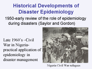 interest. In 1957, in one of the earliest reviews of on the role of epidemiology during natural disaster, Saylor and Gordon considered disasters as epidemics and suggested using well-defined epidemiologic parameters such as time, place, and person to describe disasters. However, the practical application of epidemiology to disaster management really began with the massive international relief operations mounted during the civil war in Nigeria in the late 1960s. Epidemiologists from the Center ofor Disease Control (CDC) helped to develop techniques for the rapid assessment of nutritional status and to conduct surveys to identify the population in need. Epidemiologists developed survey tools (such as the quakstick) and survey methods with which to rapidly assess the nutritional status of large displaced populations so that relief could be targeted to those groups in greatest need. During the 1970s, the need for disaster epidemiology was apparent in many disaster relief operations, however lacked of skilled personnel made disaster management very difficult. These problems of coordinating a disaster response are compounded by the conditions generally created by a disaster, including difficult logistics, a lack of communication, transportation, and local supplies and support. For overview of Instrument for Rapid Assessment of Injuries and Other Medical Conditions, look at the following CDC website: |