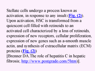 | There are no activated hepatic stellate cells in the normal human liver, as demonstrated by the absence of cells positive for a-smooth muscle actin. Other studies have demonstrated activated hepatic stellate cells (HSCS) in patients with HCV and fibrosis [5, 6]. Proliferation of HSCs occurs in regions of greatest injury, and is typically preceded by an influx of inflammatory cells and is followed by accumulation of collagenous and noncollagenous proteins of ECM. |