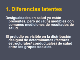 Así, esta hipótesis supone que la salud ya está presente, pero no es (aún) medible con comunes mediciones de resultados de salud. El preludio es visible con la distribución desigual de diferentes determinantes (v.gr. Factores estructurales/conductuales) de salud entre los grupos sociales. |