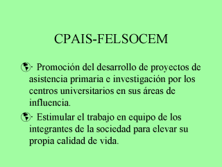 Teniendo como base atención primaria de salud y con el objeto de favorecer el conocimiento e intercambio de experiencias entre países Latinoamericanos, ayudar a formulación de modelos viables de Atención Primaria en América Latina y analizar experiencias y perspectivas de la formación de estudiantes en esta rama, se crea el Comité Permanente de Atención Integral de Salud (CPAIS) de la Federación Latinoamericana de Sociedades Científicas de Estudiantes de Medicina