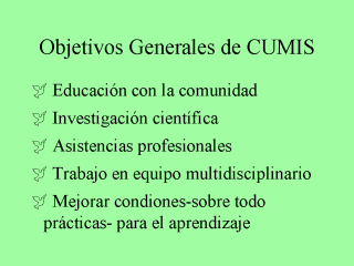 OBJETIVOS GENERALES 1. Establecer un mecanismo de educación que permita mejorar la calidad de vida en la comunidad. 2. Realizar una investigación científica que sirva no sólo para analizar el desmpeño del equipo local de salud y de profesiones afines, sino también para arrojar datos epidemiológicos que permitan una mejor comprensión de la problemática real que padecen nuestros pueblos. 3. Ofrecer asistencias profesionales a grupos de difícil acceso ya sea geográfico, social o económico a estos servicios. 4. Mejorar condiones-sobre todo prácticas- para el aprendizaje de nuestros estudiantes considerando las recomendaciones actuales de la pedagogía que propulsan el desarrollo de habilidades "in situ" y en el lugar de los hechos reales. 5. Fomentar el trabajo en equipo multidisciplinario ya sea a nivel local o regional |