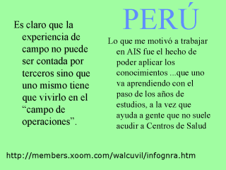 Lo que me motivó a trabajar en AIS fue el interés en realizar trabajos de campo en comunidades del Perú, además la posibilidad de realizar invetigación y resolver algunos problemas con la comunidad. El trabajo de campo se puede convertir en una experiencia fascinante si se tienen ganas de trabajar por un pais al cual le falta mucho por hacer y nos abre un panorama acerca de las diversas posibilidades de servicio que se pueden ofrecer. El entusiasmo con que la gente recibe este tipo de programas es impactante. Una preculiar forma de conocer el Perú. Algunas fotos y trabajos del IRIS II están disponibles en ( lastima que este un poco desactualizada): http://members.xoom.com/walcuvil/infognra.htm Particularmente considero que este tipo de programas debería incluirse en la currícula (como electivo o dentro de algún curso como Saud Pública) de nuestros países ya que es una interesante forma de realizar labor social e investigación. Félix K. Llanos Tejada , 7mo año, Medicina, Universidad Peruana Cayetano Heredia, trabajando en AIS cerca de 3 añosLa experiencias que más me impactó de AIS es el ver a los niños llegar de la mano de sus hermanos mayores porque sus padres se encuentran trabajando con la finalidad de ser atendidos y/o de ver a los doctores recién llegados de la capital. Considero que para mejorar el trabajo de AIS, debe ser incluída en la currícula para ser algo que forme parte del proceso de atracción hacia una sociedad científica. |