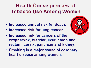years. The risk for lung cancer increases with quantity, duration, and intensity of smoking. The risk for dying of lung cancer is 20 times higher among women who smoke two or more packs of cigarettes per day than among women who do not smoke. Smoking is a major cause of cancers of the oropharynx and bladder among women. Evidence is also strong that women who smoke have increased risks for liver, colorectal, and cervical cancer, and cancers of the pancreas and kidney. For cancers of the larynx and esophagus, evidence among women is more limited but consistent with large increases in risk. Smoking is a major cause of coronary heart disease among women. Risk increases with the number of cigarettes smoked and the duration of smoking. Risk is substantially reduced within 1 or 2 years of smoking cessation. This immediate benefit is followed by a more gradual reduction in risk to that among nonsmokers by 10 to 15 or more years after cessation. |