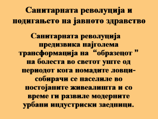 Санитарната револуција во 19-тиот век потекнува од откритието Snow, а е помогната од работата на другите: William Farr, доктор и експерт за витална статистика, првиот компилатор на резимеата во новосоздаденото одделение English Registrar General; микробиолозите Louis Pasteur i Robert Koch; патологот-санитарец Rudolph Virchow; социјалните реформатори и рани јавно-здравствени специјалисти Edwin Chadwick, Lemuel Shattuck, John Simon и набрзо по тоа цел батаљон од други. Човековите живеалишта беа лулка на цивилизацијата, но во отсуство на соодветна хигиена и санитација, тие беа исто така и живеалиште на штетници и болести. Во 19-тиот век, градовите беа опасни места, преполни со болести и предвремена смртност. Повеќе од една четвртина од живородените деца умираа во првата година од животот, а половина од нив пред да бидат доволно стари за да имаат сопствени деца. Тие умираа од гастроинтестинални и респираторни инфекции: колера, тифус, детска дијареа, дифтерија, сипаници, воспаление на белите дрибови, туберкулоза... Автор на слајдот: John Last, Canada *Забелешка: санитарната револуција се однесува на промените во јавно-здравствените навики што се случуваа во Северна Америка и Европа кон крајот на 19-от век. |