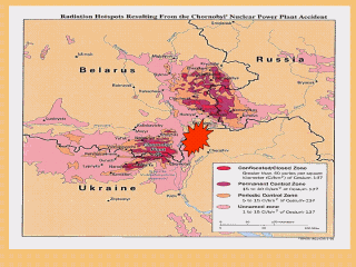 Најголемиот инцидент со радиоактивно зрачење се случи во нуклеарната електрична централа во Чернобил (Chernobyl), во близината на Припјат, во Украина, на 26 април 1986 година. Повеке од 600,000 луѓе учествуваа во проектот за расчистување, мегу кои 200,000 беа Украинци. Работите се одвиваа до 1990 година. Радиоактивната контаминација се прошири на територијата на Украина, Белорусија и Русија. Густината на контаминацијата е покажана на картата. Има депозиција на радиоактивен Cs-137 во околината на Чернобил. Наспроти различните успеси на санитарната револуција, здравјето на нашата животна средина се уште е голем проблем. Несреќата со чернобилската нуклеарна електрана сите ги потсетува колку е значајно да се спречат загадувањето на околината и останатите закани по здравјето, кои се предизвикани од човековата активност. Здравствените ефекти од озрачувањето и мерките за секундарна превенција за оние кои беа изложени се голем проблем за јавно-здравствените професионалци во Украина и другите региони. Автор на слајдот: Boris Ledoshchuk, MD, PhD, Ukraine |