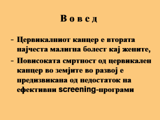 Повеке од 471,000 нови случаи на цервикален канцер се дијагностицираат секоја година, предоминантно во земјите во развој (1998). Повисоката смртност од цервикален канцер во земјите во развој е последица од недостаток на ефективни screening-програми, насочени кон детекција на предканцерозните состојби и нивно третирање пред тие да прогредираат во инвазивен канцер. Ефективните screening-превентивни програми, имаат голема можност да го намалат бројот на смртни случаи поради хронични болести. Автор на слајдот: Naila Baig Ansari, Dept. of Community Health Sciences, The Aga Khan University Karachi, Pakistan, |