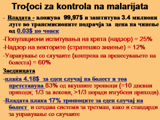 Контролата на маларијата е сериозен проблем за здравствените професионалци во провинцијата Хенан, во Кина. Презентираниот слајд покажува дека во овој пример чинењето на болеста по еден човек е повеке од 100 пати поголема, отколку чинењето на превенцијата. Професор Xi-Li Liu, TDR/WHOProekt, Главен истразувач Henan Provincial Institute of Parasitic Diseases, China |