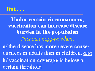 unimmunised part as well. Nevertheless, there is also a risk: because of the phenomenon of herd immunity, under certain circumstances, a vaccination programme can do more harm than good on a population basis. This might arise if a/ the target disease has more severe clinical consequences in adults than in children, and b/ the vaccination coverage achieved is below a certain threshold (the "sorcerers apprentice" situation). Such diseases include rubella, chickenpox, mumps, hepatitis A. |