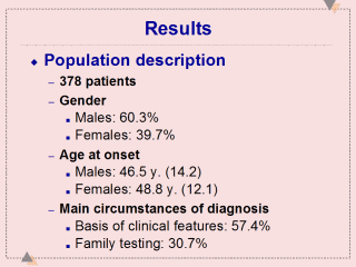 This cohort included 378 subjects of whom 60.3% were males (sex ratio: 1.5). The age at onset tended to be higher in females than in males (48.8 y. versus 46.5 y. – p = 0.053). The diagnosis was mainly made on the basis of clinical features (57.4%) or trough family testing (30.7%).