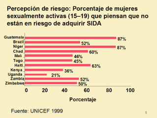 | VIH/SIDA es una pandemia mundial de proporciones sin precedentes. Lugares con escasos recursos, en el mundo en desarrollo, primariamente, llevan la mayor carga de la enfermedad en término de números absolutos, proporciones de niños y adultos infectados y enfermedad y muerte secundarias a VIH. Sin embargo, muchas mujeres jóvenes activas sexualmente viviendo en el mundo en desarrollo no creen estar en riesgo de adquirir SIDA. |