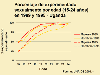 | En Uganda, la epidemia de VIH fue reconocida relativamente temprano y esfuerzos preventivos fueron iniciados a nivel nacional, incluyendo el involucramiento y compromiso de líderes políticos, comunitarios, religiosos; anuncias radiales acerca de VIH/SIDA; disposición social de condones y disponibilidad extensa de consejería y examen voluntarias acerca de VIH. Como se muestra en esta figura, desde 1989 ha habido un retraso en la primera experiencia sexual de hombres y mujeres jóvenes. |