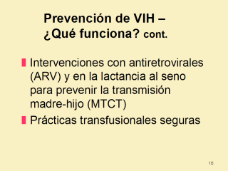 | También incluye el uso de drogas antiretrovirales y alternativas de o modificaciones de las prácticas de lactancia al seno materno para reducir la transmisión madre-hijo; y las prácticas seguras de transfusiones. |