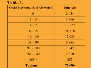 Tablo 1. Türkiyede iş kazalarının geçici iş göremezlik sürelerine göre dağılımı (4)