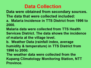 Data of TTS District. The altitude data were collected from the Planning and Development Bureau of TTS District and the Planning and Development Bureau of Nusa Tenggara Timur (NTT) Province. d. The Population of TTS District (2000) Data of TTS population were obtained from the Bureau of Statistic of TTS District based on the Indonesian Population Census 2000. This 2000 population data was also used to calculate the number of population of TTS District from 1995 to 1999 by using formula below (Parker, 2002): Pt = Po x (1 + r) – n Po = Population in 2000 Pt = Population in t year (1995 – 1999) n = number of year growth (2000 – t year) r = Population Growth Rate (1.64%)* * Based on Indonesian Bureau of Statistic, 2002 e. Observation Due to the complexity of the malaria problem, observation has also been made to some extent to obtain some additional information regarding to malaria program in TTS District. |