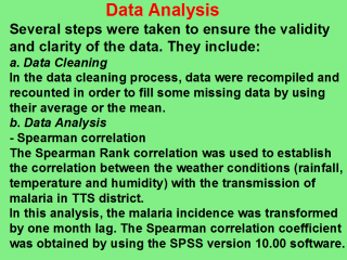 | - ANOVA This type of statistical analysis was used to determine if there was a significant relationship between malaria incidence in TTS district and altitude. This analysis was done by using the SPSS version 10.00 software. - Geographical Information System (GIS) Using the Arc View 3.1 software, some of the information that has already been analyzed was mapped in order to show the distribution of malaria transmission in TTS District. |