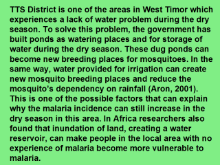 malaria areas or even malaria free areas (MARA, 1998). Interestingly, the malaria transmission pattern at village level was different from the general pattern at district level. At least in four villages, rainfall, a significant positive correlation with malaria incidence. So, as the rainfall increases the malaria incidence increases as well. |