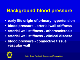 niet zeggen dat alle oorzaken bekend zijn. Bloeddruk is positief geassocieerd met arteriele vaatwandstijfheid. Bij de mens vooral onderzocht met non-invasieve ultrasonografische vaatwandmetingen. Vaatwandstijfheid is op zichzelf geassocieerd met atherosclerose en met klinische ziekte. Recente literatuur geeft aan dat er ook een directe relatie is tussen de bloeddruk en de hoeveelheid en samenstelling van het bindweefsel in de arteriele vaatwand. |