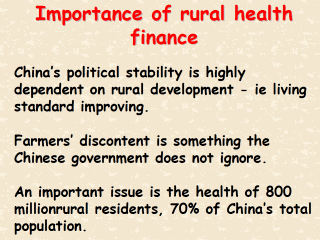 1994: Beijing asked rural areas to reform health finance: "rural co-operative medical schemes" (RCMS).