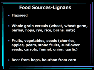 Among western populations who tend to consume fewer soy products, lignans are the predominant class of phytoestrogens in the diet. The richest source of lignans are whole grains and seeds. Flaxseed, which is widely consumed in Scandanavian countries contains large amounts of lignans. Lignans are also found in fruits, vegetables, beer from hops, and bourbon from corn. |