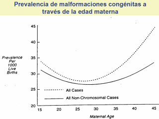 Prevalencia de malformaciones congénitas a través de la edad materna: California, 1983-1986. Fuente: Reprinted from Croen, L.A., and Shaw, G.M., Young Maternal Age and Congenital Malformations: A Population-Based Study, American Journal of Public Health, Vol. 85, p. 711, with permission of the American Public Health Association, (C) 1995
