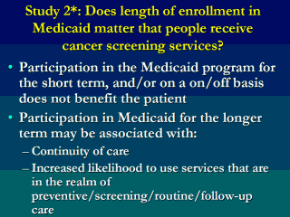 | *Koroukian SM. Length of Enrollment in Medicaid Predicts the Use of Screening Mammography Among Ohio Medicaid Beneficiaries. Accepted for Publication, J Clin Epidemiol. |