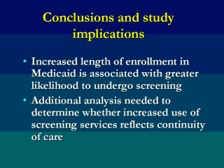 Methodological: Importance to account for length of participation in Medicaid in studying use of screening/preventive services;