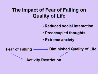Fear of falling with or without activity restriction is associated with lower scores on quality of life measures. Characteristics that are associated with diminished quality of life include reduced social interaction, a preoccupation with fear of falling, and extreme anxiety that detracts focus from activity performance. |