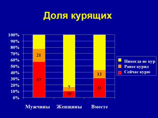 Исследование выявило очень высокий процент курящих среди мужчин и более низкий процент среди женщин.