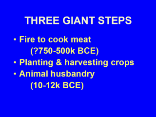 Some 12,000 to 14,000 years ago as the world warmed up after the last Ice Age, two more discoveries transformed human communities forever. Our forebears, perhaps the women, learnt how to domesticate animals for food, milk and clothing. About the same time they discovered that seed grain could be planted, harvested, and stored from one season to the next, as well as used to make flour and thence bread and similar high-density carbohydrate foods. These great discoveries eliminated reliance on precarious hunting and gathering, and made permanent human settlements possible. They were the indispensable basis for every human achievement since.