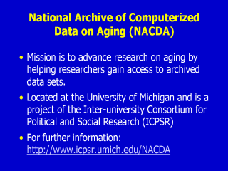 The NIA supports a library of computer available data on aging at the NACDA. The