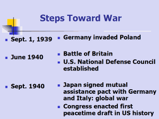 | When President Roosevelt dedicated the NIH campus, the U.S. remained neutral in the European conflict that had broken out on September 1, 1939. After Great Britain was attacked in June 1940, a U.S. National Defense Council was established, and in September, after Japan signed a mutual assistance pact with Germany and Italy and the war became global in scope, Congress enacted the first peacetime draft in U.S. history. |