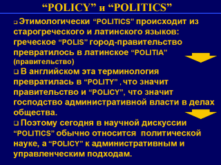 интернациональных слов описывает "POLITICS" как исскуство управлять, а также
